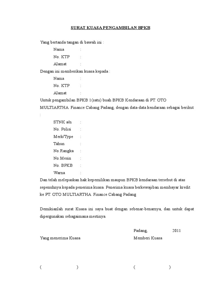 Pengambilan bpkb tersebut dilakukan di kantor adira finance, jl. Contoh surat kuasa pengambilan bpkb. Sebelum kita membahas cara menulis surat kuasa pengambilan bpkb untuk kendaraan motor atau mobil, di bawah ini adalah syarat pengambilan bpkb di setiap leasing yang bisa anda pelajari. Kamu ingin mengambil bpkb tapi sedang berhalangan dan tidak bisa datang langsung, tenang kamu hanya perlu membuat surat kuasa. Jika anda pernah membeli kendaraan dengan cara kredit atau angsuran, maka tentu sudah kenal dengan perusahaan ini, sekalipun anda mungkin.